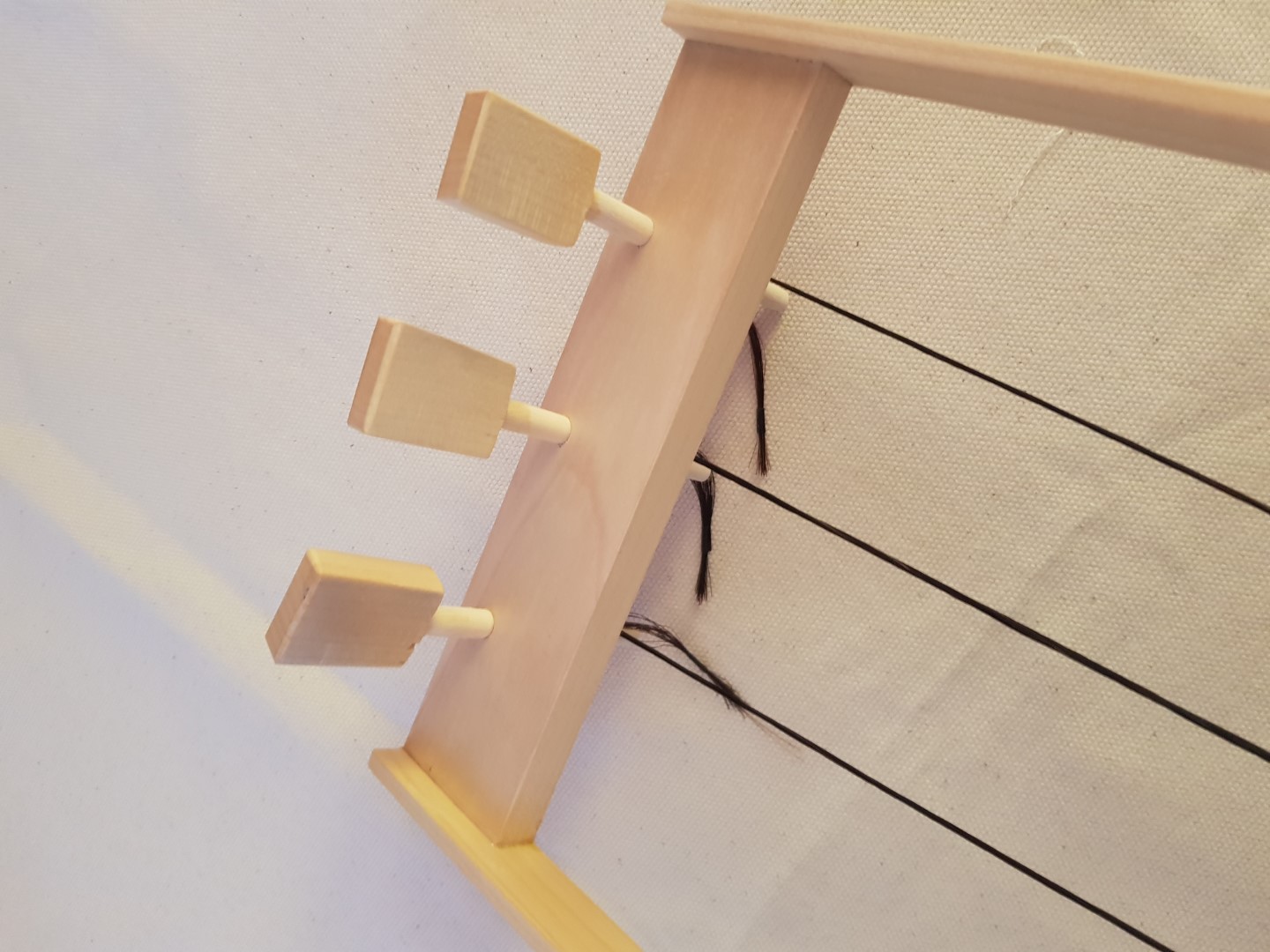 -Je zult ook een boog moeten maken (of je koopt een vioolstrijkstok). Hier zijn ook weer geen vaste maten voor. Voor een normale lengte (ongeveer 70cm) heb je minimaal 120 paardenharen nodig. Ik gebruik hier meestal beuk voor omdat dat makkelijk te buigen is. Let hier goed op de nerf/draad. Kwartiers gezaagd hout is hier belangrijk i.v.m. buigen.