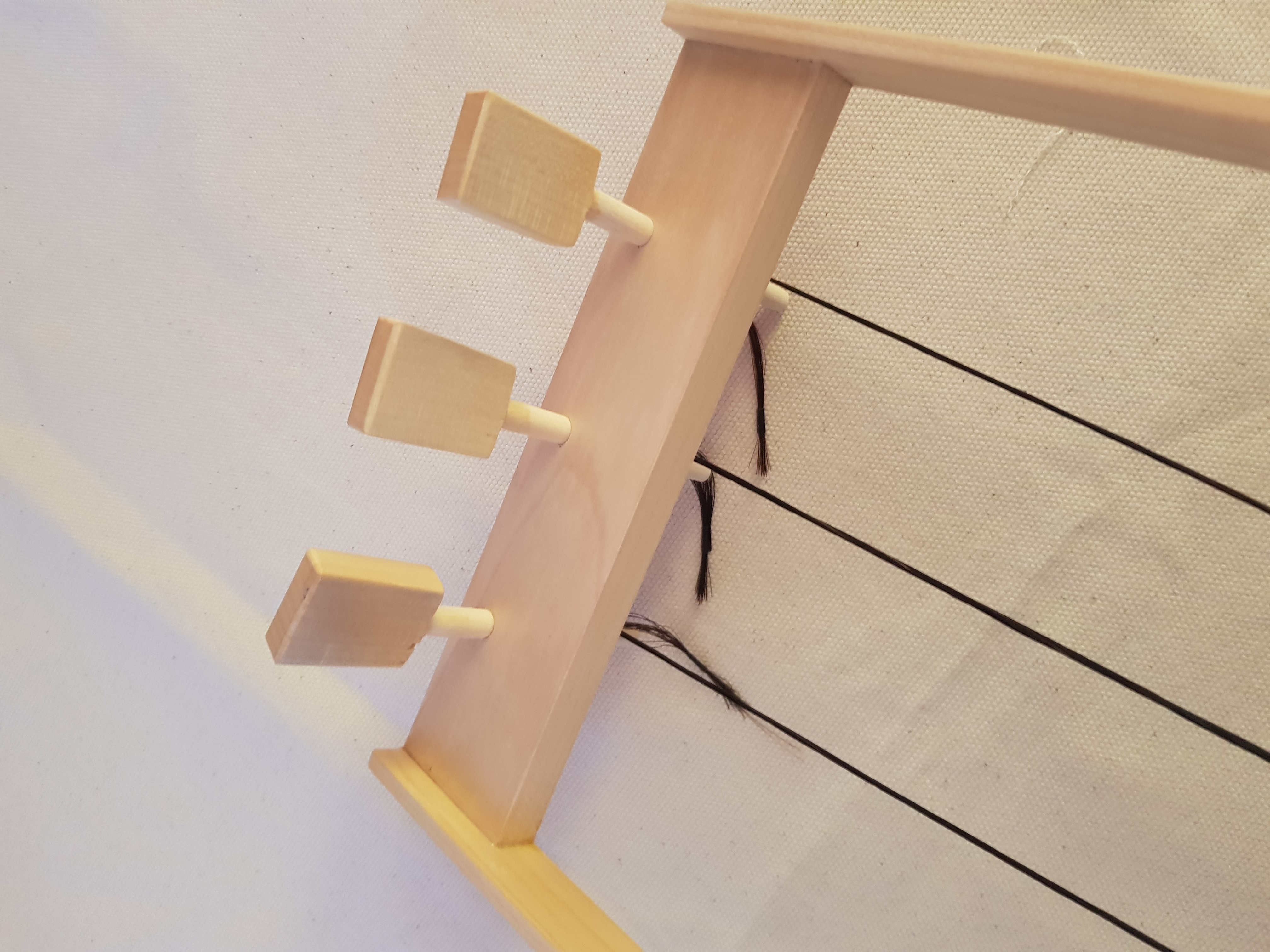 -Van oudsher worden de snaren van paardenhaar gemaakt. Afhankelijk van je snaarlengte en stemming moet je uitvogelen hoeveel haren per snaar. Tegenwoordig wordt ook wel vislijn of Dacron gebruikt, dit is minder gevoelig voor weersomstandigheden maar klinkt net anders. Eventueel gebruik je viool of cellosnaren (dat laatste voor een bas tagelharpa). Hoe je je Tagelharpa stemt is eigen voorkeur. EAE DAD EAD eBE AEA kan allemaal. Bij een snaarlengte va 33 cm (van de stemknop tot de brug) kun je denken aan 30 tot 35 haren voor de eerste twee snaren en 40 voor de lage snaar. Ik ben er ook nog steeds niet uit wat nu het beste is.