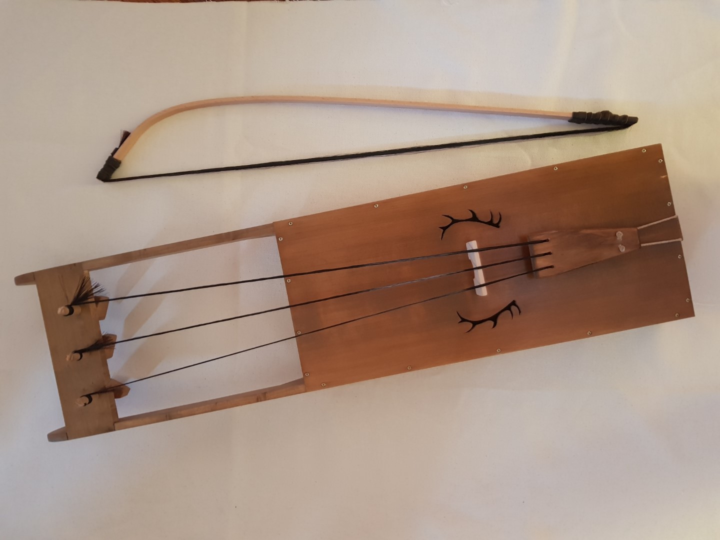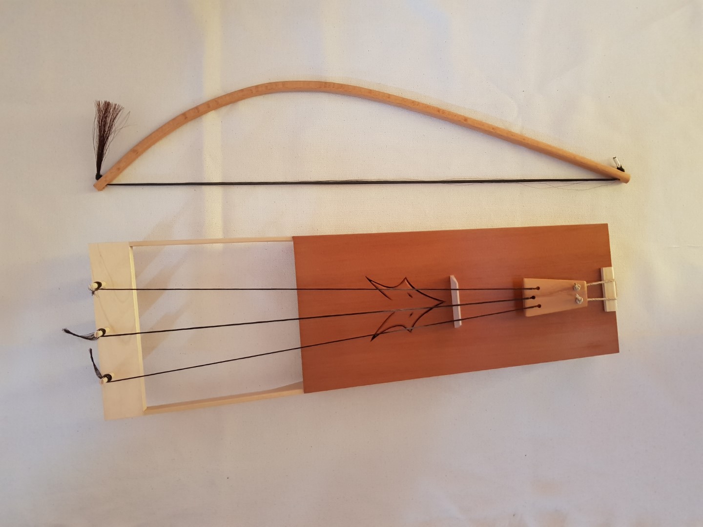 -Je zult ook een boog moeten maken (of je koopt een vioolstrijkstok). Hier zijn ook weer geen vaste maten voor. Voor een normale lengte (ongeveer 70cm) heb je minimaal 120 paardenharen nodig. Ik gebruik hier meestal beuk voor omdat dat makkelijk te buigen is. Let hier goed op de nerf/draad. Kwartiers gezaagd hout is hier belangrijk i.v.m. buigen.